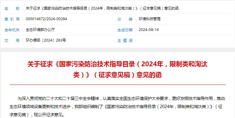 生態(tài)環(huán)境部日前發(fā)布《國家污染防治技術(shù)指導目錄(2024 年,限制類(lèi)和淘汰類(lèi))》(征求意見(jiàn)稿)。