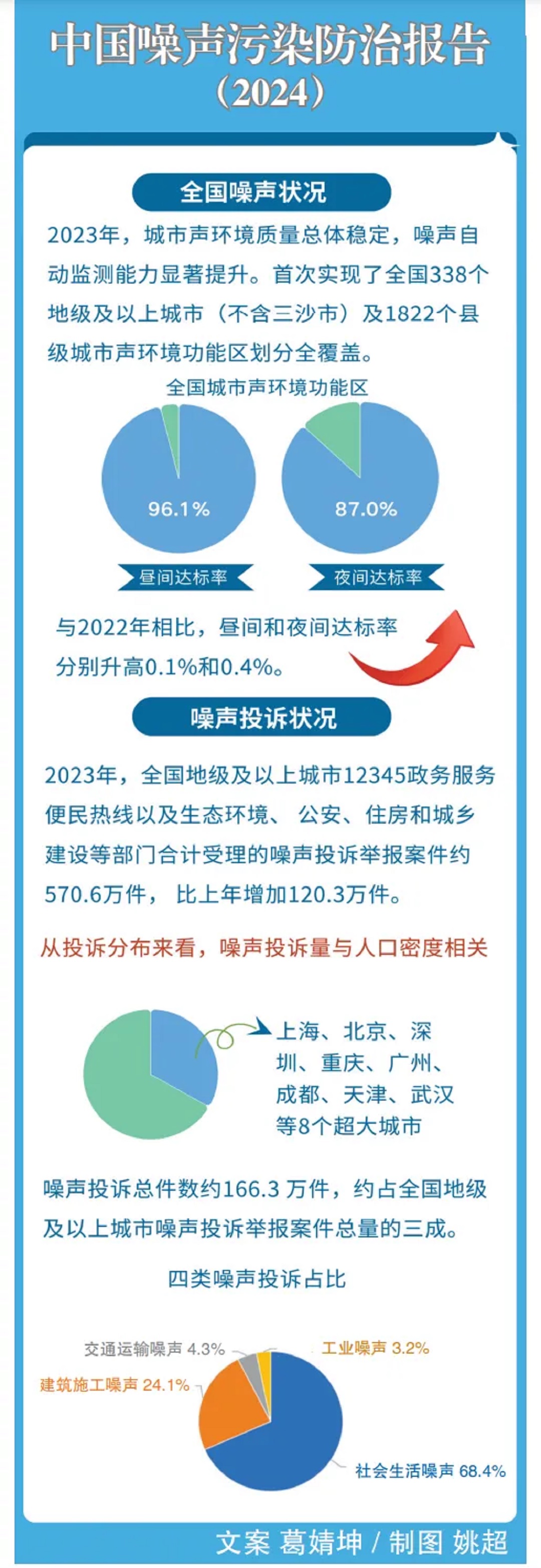 雖然局部噪聲投訴舉報數量升高,但是全國城市聲環(huán)境質(zhì)量總體穩定?!秷蟾妗分赋?,2023年,全國聲環(huán)境功能區晝間達標率為96.1%,夜間達標率為87.0%。與2022年相比,晝間和夜間達標率分別升高0.1個(gè)百分點(diǎn)和0.4個(gè)百分點(diǎn)。