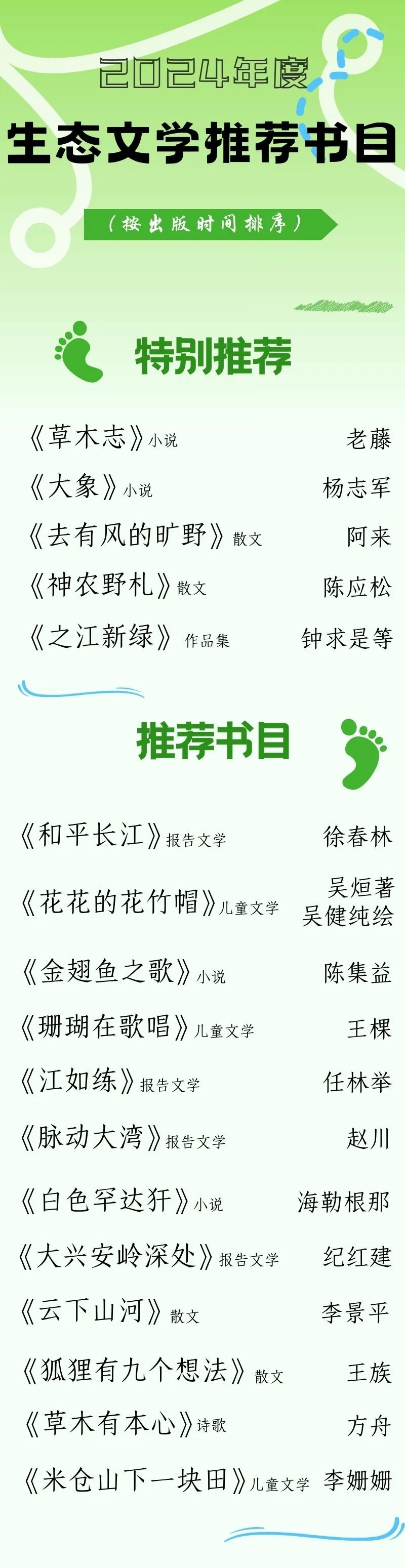 按出版時(shí)間為序,5部“特別推薦書(shū)目”分別是《草木志》《大象》《去有風(fēng)的曠野》《神農野札》《之江新綠:“千萬(wàn)工程”的詩(shī)意記述》;12部“生態(tài)文學(xué)推薦書(shū)目”分別是《和平長(cháng)江》 《花花的花竹帽》 《金翅魚(yú)之歌》《珊瑚在歌唱》《江如練》《脈動(dòng)大灣》《白色罕達犴》《大興安嶺深處》《云下山河》《狐貍有九個(gè)想法》《草木有本心》《米倉山下一塊田》。