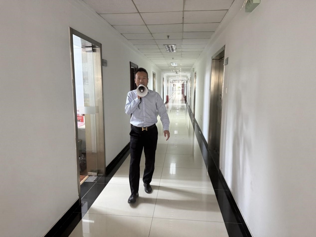 理論知識講解結束后,全體員工來(lái)到樓道進(jìn)行消防實(shí)操演練。演練現場(chǎng),王恒遠首先實(shí)地示范了滅火器的正確使用方法:“使用滅火器時(shí),要先拔掉保險銷(xiāo),然后握住噴管,對準火焰根部,按下壓把進(jìn)行噴射……”。疏散逃生演練環(huán)節,全體員工,用濕毛巾捂住口鼻,在安全員引導下按預定疏散路線(xiàn)從消防通道有序撤離,3分鐘內全員安全集結至樓下室外空曠區域。