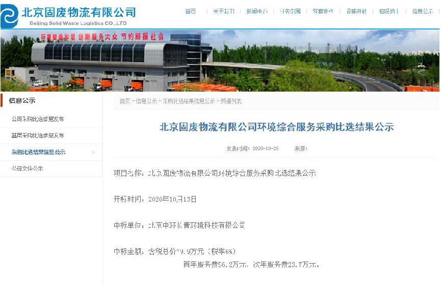 2020年10月28日,由北京固廢物流有限公司組織的“北京固廢物流有限公司環(huán)境綜合服務(wù)”招采項目,經(jīng)過(guò)充分比選并基于中環(huán)長(cháng)青商務(wù)、技術(shù)團隊的技術(shù)服務(wù)實(shí)力和業(yè)績(jì),公司成功中標該項目。