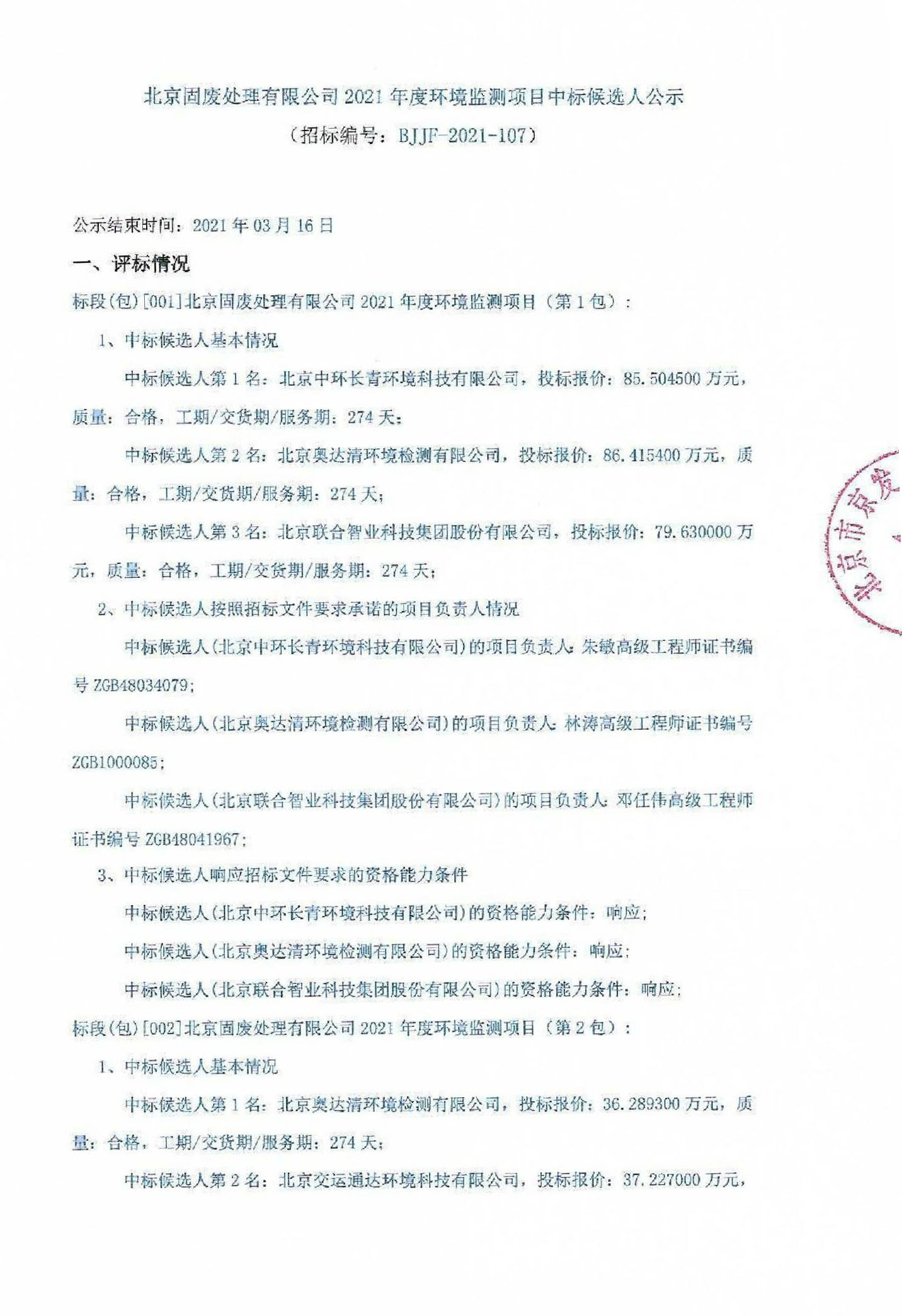 2021年3月12日,北京中環(huán)長(cháng)青環(huán)境科技有限公司作為第一候選人中標北京環(huán)衛集團下屬北京固廢處理有限公司2021年度環(huán)境監測項目。此次項目服務(wù)對象為阿蘇衛垃圾衛生填埋場(chǎng)、安定垃圾衛生填埋場(chǎng)、北神樹(shù)垃圾衛生填埋場(chǎng),服務(wù)內容需要對上述三個(gè)垃圾場(chǎng)周邊環(huán)境進(jìn)行環(huán)境數據監測服務(wù)。監測介質(zhì)主要包含廢氣及環(huán)境空氣、排氣筒大氣、鍋爐尾氣、食堂油煙排氣、廢水及水環(huán)境、地下水、生活飲用水、雨水、廠(chǎng)界噪聲、固液分離渣、絮凝渣、污泥、土壤等。