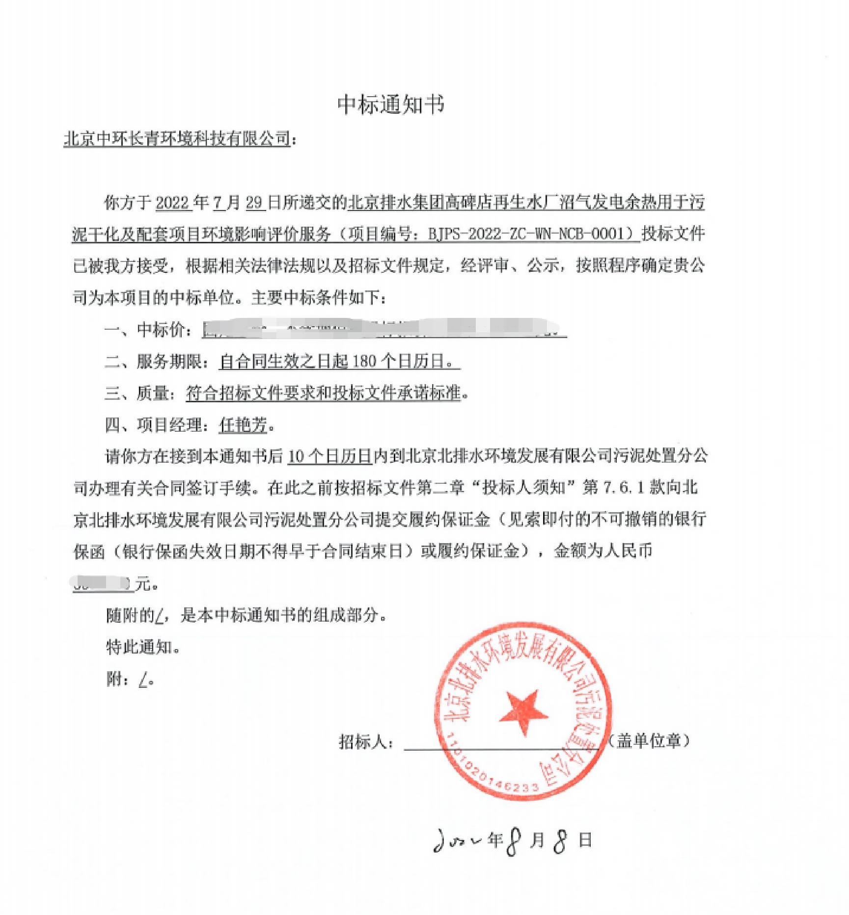 2022年7月29日中環(huán)長(cháng)青準時(shí)參加了《北京排水集團高碑店再生水廠(chǎng)沼氣發(fā)電余熱用于污泥干化及配套項目環(huán)境影響評價(jià)服務(wù)》的開(kāi)標事宜,按照要求遞交了投標響應文件,經(jīng)過(guò)評標專(zhuān)家委員會(huì )的審查、評比,最終推薦中標候選人為北京中環(huán)長(cháng)青環(huán)境科技有限公司。